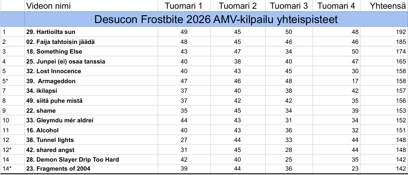Klikkaa taulukkoa suuremmaksi. Finaalista karsiutuneet videot saivat 71-135 yhteispistettä per video.